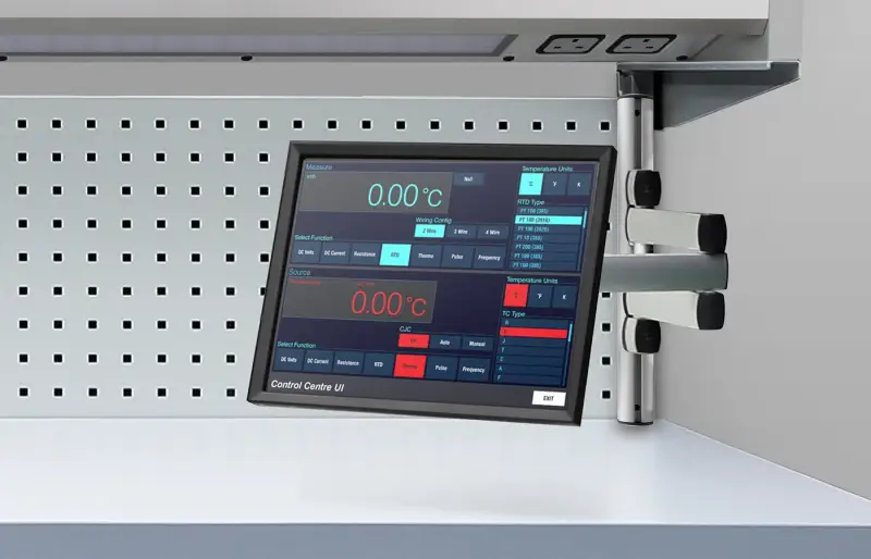 Un porte-documents de format A3 incliné est idéal pour placer les manuels d'utilisation des appareils testés ou les guides pour les étudiants dans les centres de formation. Les bras du moniteur se montent sur le panneau et se connectent au port HDMI (sous la console) pour étendre l'affichage du module du centre de contrôle PC.